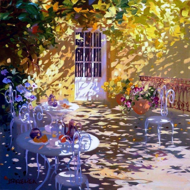 Несмотря на это роман очень светлый! Тёплый, солнечный... Быть может ещё потому, что очень повезло с чтецом - Олегом Винярским! Его голос, нарочито медленный, с особыми наивными интонациями - для Лужина и милыми, очаровательными - для его супруги, лёг на повествование как нельзя лучше. И длинные-длинные-длинные набоковские фразы в его прочтении, как бесконечные переплетающиеся нити того тонкого полотна, через которое пробивается Солнце. Оттого и прикрепляю к отзыву одну из картин Лорана Парселье - как часть ассоциации. Обязательно буду знакомиться с произведениями Набокова дальше.