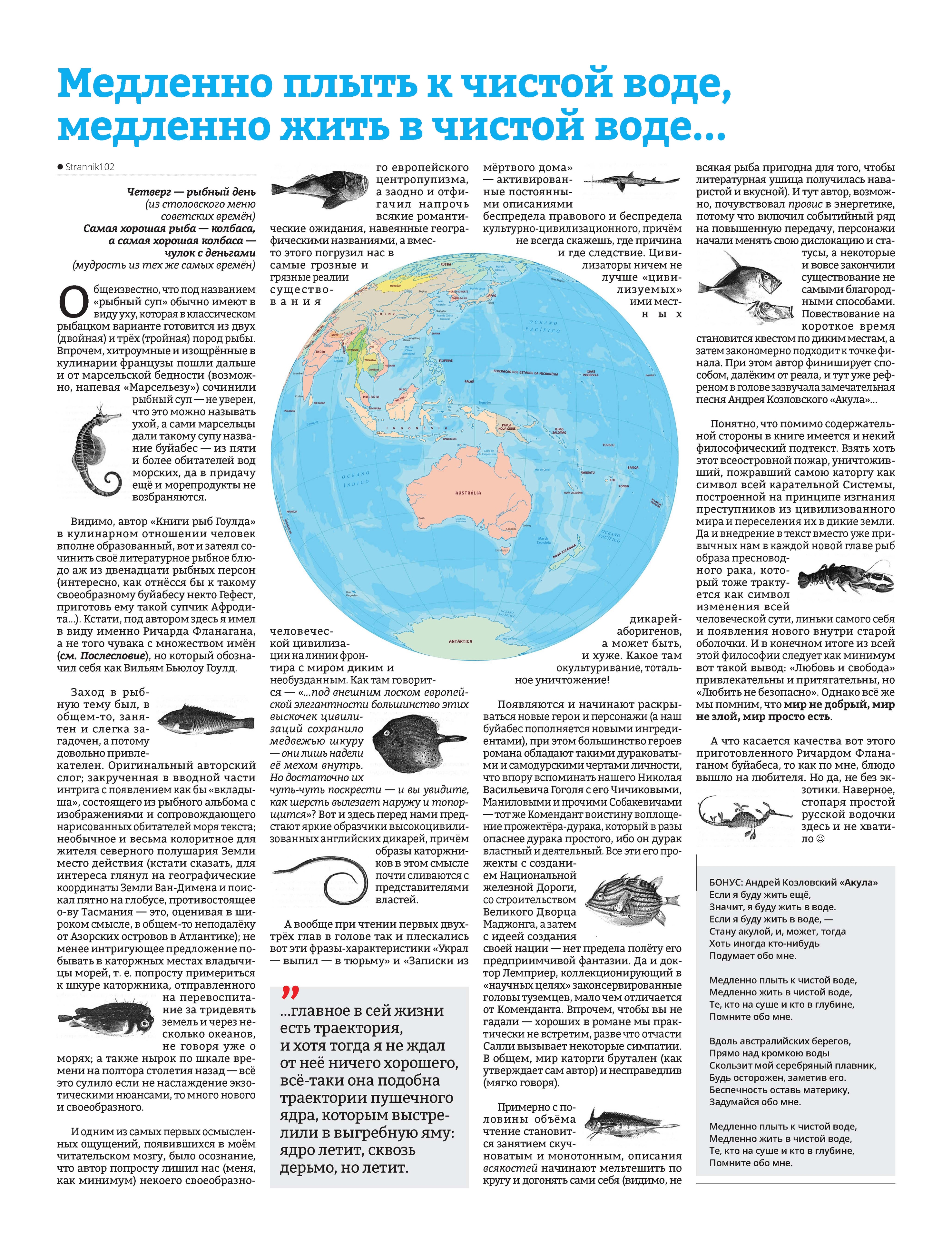 Видимо, автор «Книги рыб Гоулда» в кулинарном отношении человек вполне образованный, вот и затеял сочинить своё литературное рыбное блюдо аж из двенадцати рыбных персон (интересно, как отнёсся бы к такому своеобразному буйабесу некто Гефест, приготовь ему такой супчик Афродита…). Кстати, под автором здесь я имел в виду именно Ричарда Фланагана, а не того чувака с множеством имён (см. Послесловие), но который обозначил себя как Вильям Бьюлоу Гоулд.