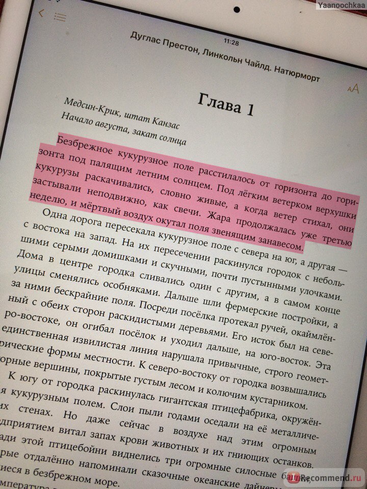 Аноним25 ноября 2017 г.Читать далееБескрайние поля кукурузы. Представить легко, фильмы и сериалы создали такой образ, который в память навсегда врезается. И все мы понимаем, что среди зрелых початков и удушающего зноя всегда что-то прячется. И «Натюрморт с воронами» начинается с того, что шериф маленького городка, затерявшегося среди полей, находит среди кукурузы изуродованный труп девушки, а вокруг него вороны, нанизанные на древние индейские стрелы. Первая мысль - ритуальное убийство! Но это было бы слишком просто. И на сцене появляется агент ФБР Пендергаст. Вот вам смешно, а это такой персонаж, в которого невозможно не влюбиться. Безупречный чёрный костюм, дорогая обувь и манеры. И мы хватаемся за сердечко в ожидании разгадки. Первая половина книги будет разворачиваться неспешно, показывая нам то одну наживку, то другую. Но стоит затеряться в этом лабиринте, немного ослабить бдительность, как ты уже под землёй. Накал страстей бежит галопом, ты кричишь «дайте передохнуть, я хочу спать, а вы от книги оторваться не даёте!». И бум, тяжелым ударом по голове добивает развязка. И вот, прийдя в себя, ощупав и поняв, что обошлось, кажется, без травм, ещё одно БУМ. Держи, не ожидал? Закрываешь книгу и сидишь с довольной улыбкой от того, как это было запутанно, страшно, мерзко и... очень вкусно. Если загадок у хорошего триллера уже не осталось, то и спится как-то крепче и спокойнее.