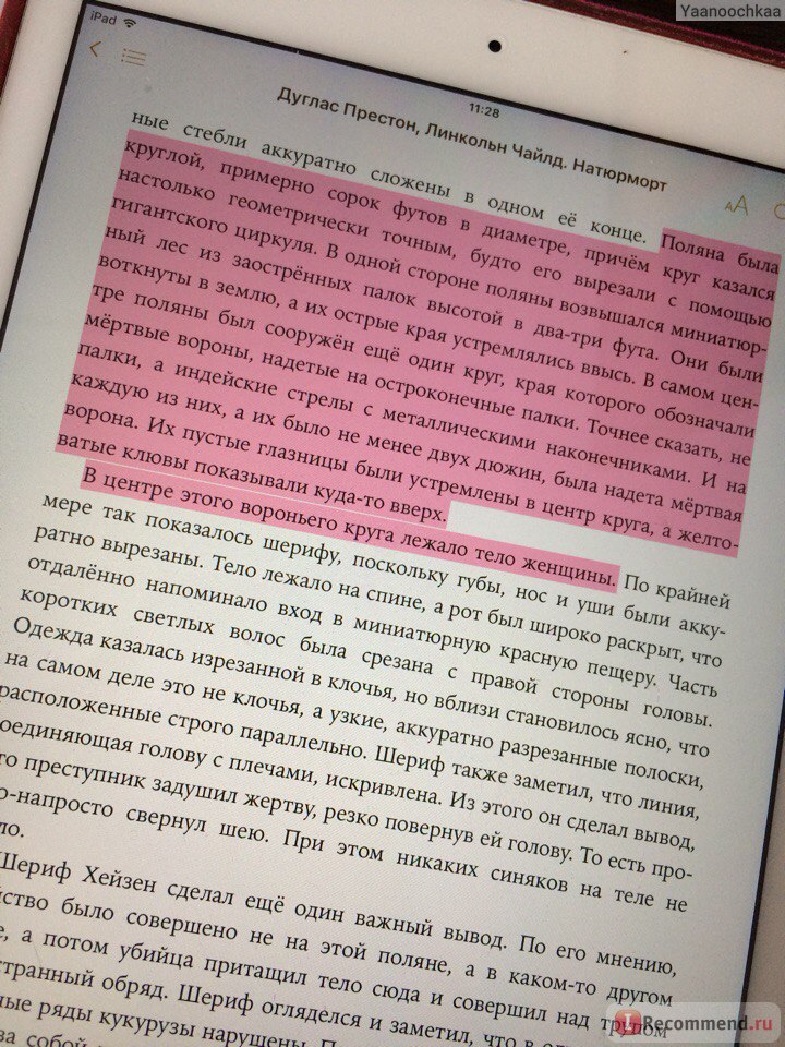 И тут я утонула в этой книге) Читается очень легко. Да, может быть в начале (первые страниц 100), не так увлекательны...но когда резко начинается дикая резня всех подряд, люди в панике, ''маньяк'' не пойман, а еще и эта древняя легенда, то начинаешь углубляться еще больше и уже не терпится узнать, чем же закончится вся эта кровавая история:))