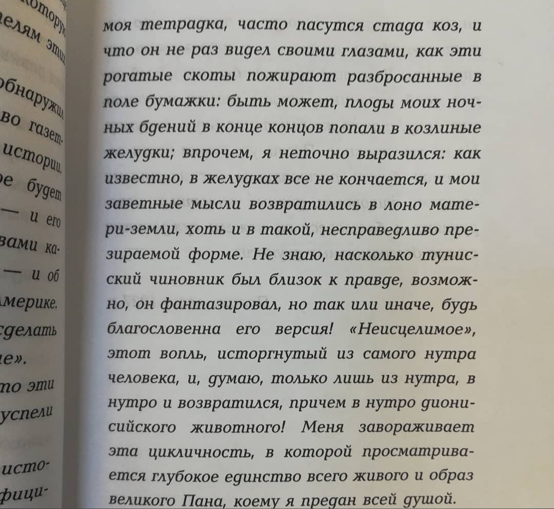 «Порфирий сказал, что дом с двумя выходами символизирует природу, всегда и во всем. Это означает: задняя дверь всегда должна оставаться открытой, чтобы гостя можно было выпроводить без скандала, и чтобы тот, кого выпроводили, мог незаметно вернуться обратно; именно так, считается, все и происходит в природе. Насилие, суеверия, своеволие, все инстинкты, все безрассудства, всё пряно благоухающее стадо страстей, которых мой разум и моральное чувство гонят со двора, потихоньку возвращаются обратно, призванные моей поэзией. Разум творит чудеса. Но затмение разума тоже может сотворить чудо» (Истинно так).Теперь как раз в моде принятие себя. Прав охотник, права его дичь. Прав Монтерлан, внезапно меняющий свои взгляды. Но не только этим сильна его книга. Поток размышлений уносит М. в разные интересные места