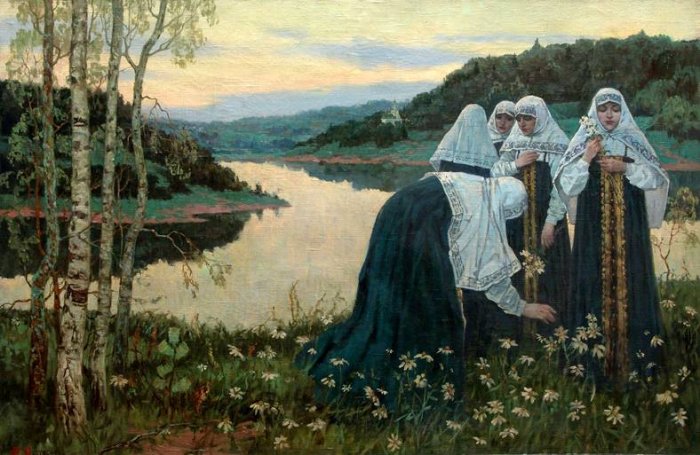 Понабравши грибов, парни огни развели, девки в глиняных плошках принялись грибы жарить. Ложек парни не захватили, девки кормят каждая своего со своей ложки. А кормя норовят, чтоб парень, ошпарив язык, глаза выпучил и слова не мог бы промолвить. А тут ложкой его по лбу да за уши драть, не забыл бы новой новинки...Что смеху тут, что веселья!..