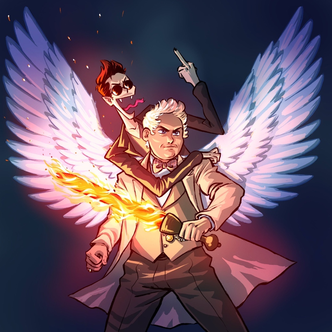 Азирафаэль и Кроули. Демон и ангел были врагами на протяжении шести тысяч лет, но за такое огромное время война перетекает в «почти дружбу», поэтому эти их совместные поиски так некстати затерявшегося сына Сатаны, философские пьянки и катание на машине выглядят по-дружески умилительно. Кроули носит солнцезащитные очки даже в тёмное время суток, маскируя свои вертикальные зрачки; его неизменный чёрный «бентли» никогда не ломается, не заправляется, не попадает в аварии и по ночам ездит с выключенными фарами. Кроули мастер поступать по-демонски, но делает он это лишь в некоторых крайних случаях. Стоило ему однажды заменить пистолеты с краской настоящими, как невинная игра на курсах менеджмента превратилась в настоящую перестрелку.