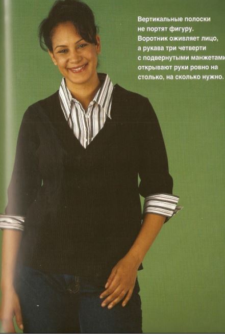красиво оденем "реальную" женщину, если совсем точно - поможем ей избежать ошибок при выборе одежды. И каждая ошибка иллюстрируется красочными фото на весь разворот - как не надо носить вещь и как надо. Кроме того, из информации на фото можно понять, какому типу фигуры (используется все тот же старый-добрый грушево-яблочный метод типирования) подходит рекомендованная одежда.
