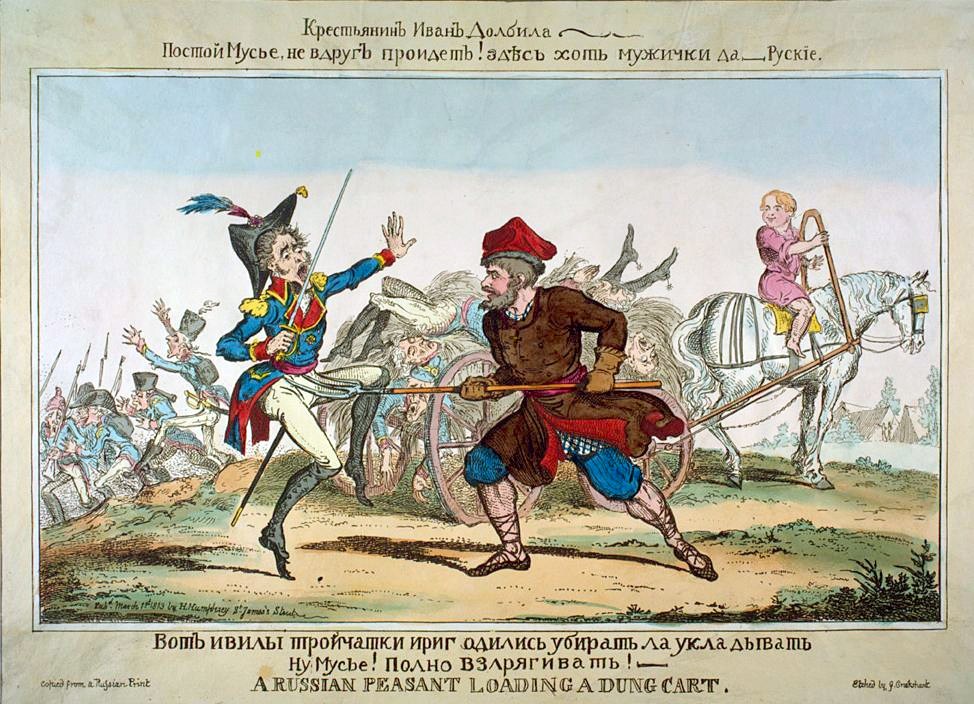 С Наполеоном будет подписан договор, а «в витринах книжных лавок на Невском по-прежнему красовались выставленные еще во время кампании карикатуры на кровожадного корсиканского узурпатора, зловеще пожиравшего младенцев, а в многочисленных соборах и церквах с прежней гневной страстью в соответствии с постановлением Священного Синода, которое никто не отменял, провозглашали анафему «богопротивному антихристу Бонапартию». Ну все, как после пакта Молотова-Риббентропа в 1939 году.