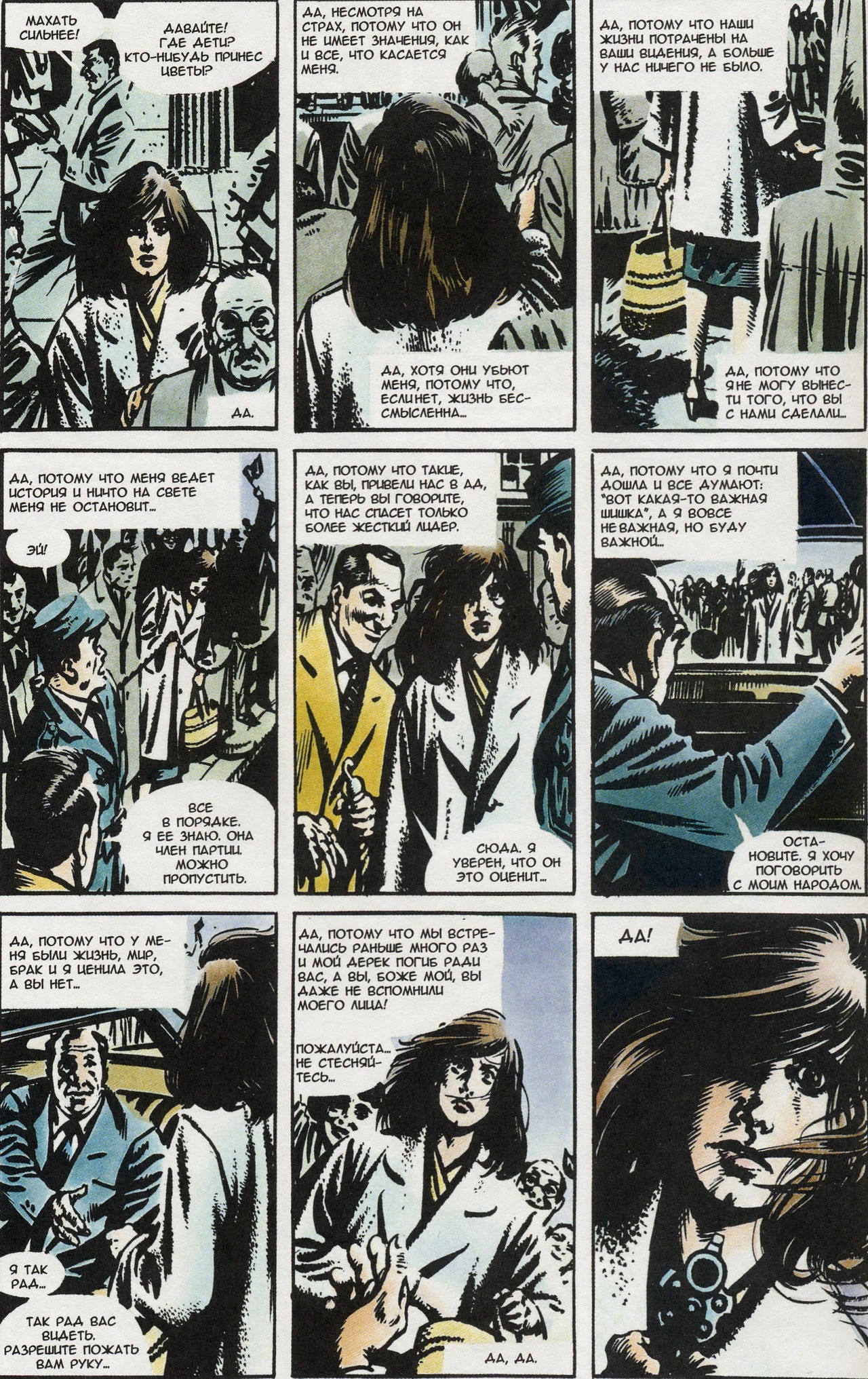 Другая линия - борьба человека с собственным страхом. Как хочется в такой обстановке закрыть глаза на все происходящее! Как приятно сжаться в теплый комочек где-нибудь в теплой комнатке с любящим человеком под боком и думать, что тебя это обойдет стороной. Что все, о чем тебе на самом деле нужно заботиться, - собственное благополучие. Только никто не думает, насколько это мещанское благополучие хрупко. Достаточно лишиться кормильца и защитника - и все. У женщины, по сути, остается только одна дорога - на панель. В комиксе эта линия получилась куда ярче, чем в фильме (блин, не удержалась все-таки).