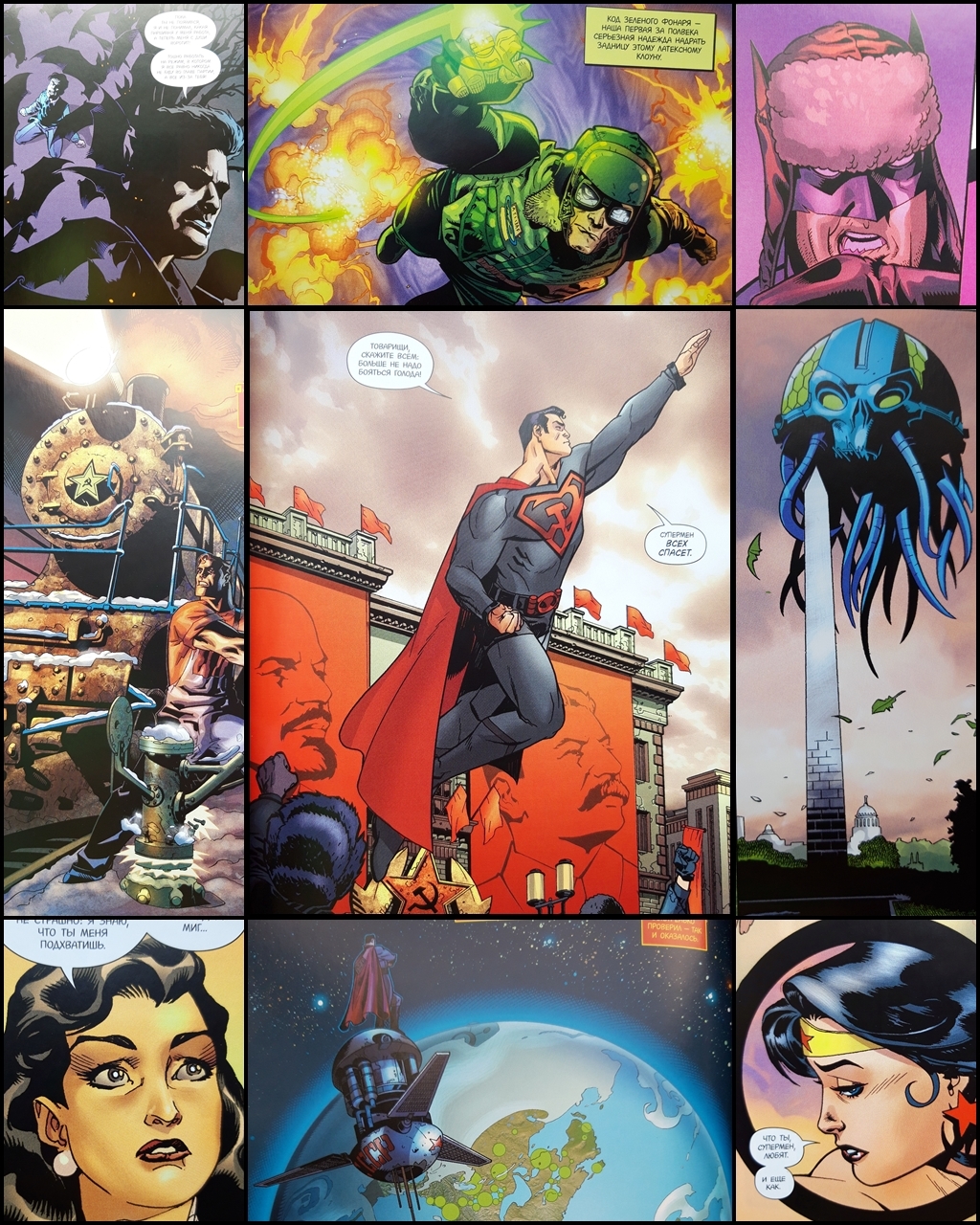 Купил – и не пожалел. Да, комикс отличный. Да, его можно читать и тем, кто, как я, в целом равнодушен к Супермену (к слову, Бэтмен и Чудо-женщина, которых я люблю больше, здесь тоже есть); хотя настоящим поклонникам Супермена, думаю, такая альтернативная его история тоже должна быть интересна. Да, как и сказано в предисловии, здесь нет однозначно прекрасной Америки, однозначно ужасного и тоталитарного СССР, и однозначно злодейского Сталина, – а всё скорее серое. Получилась хорошая, интересная и своеобразная история про Супермена, с мрачноватой эстетикой (мрачновато-DCшной и мрачновато-коммунистической) и классическим посылом о том, как благими намерениями (и желанием причинить добро и нанести справедливость всему миру) бывает вымощена дорога в ад.