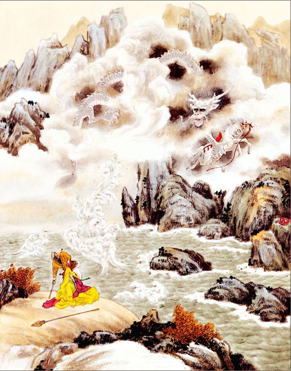 В конце первого тома монах поругался с Сунь У-куном и прогнал его, чтобы продолжить путь в более спокойной обстановке. В принципе, он и без Царя Обезьян вляпывается во всякое, так что приключения продолжаются. Подумываю о том, чтобы посмотреть сериал. Но это когда/если почитаю до конца цикла.