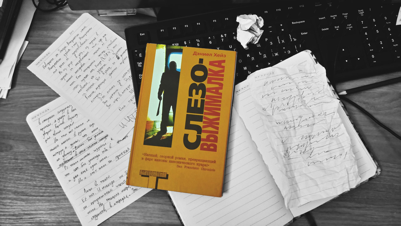 "Слезовыжималка" – трагикомедия, написанная Дэниелом Хейзом. Хейз пишет просто, без сложных метафор и красивых речевых оборотов. Его книга держится больше на диалогах и мыслях главного героя, нежели на каких-то постоянных действиях. Перед каждой главой можно встретить кусочки автобиографии самого автора, хотя вскоре границы между автором и персонажами стираются, и понять, кто из четверых написал в конечном итоге книгу, будет проблематично.