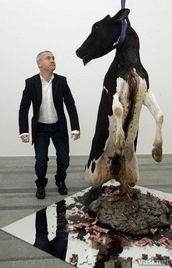 Дэмьен Херст. Жадность к наживе, 2003. Смола, коровья шерсть, канат, веревка, крючок, кровь, иракские деньги, зеркало