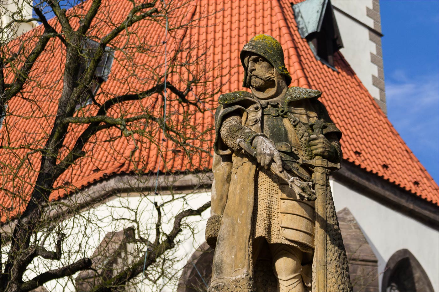 — На площади Жижки,— ответила Ксандра.— Она названа так в честь человека, основавшего этот город......Все десять пар глаз дружно взглянули в указанном направлении, на высокую статую из известняка. Это был Жижка в полном боевом облачении. Приставив ладонь ко лбу, он озирал верные ему войска. На нем красовался богатый камзол с меховой оторочкой, лицо казалось суровым и решительным, отсутствующий глаз прикрывала легендарная повязка. Другой пронзительно и всевидяще смотрел из-под низко надвинутого на лоб шлема. В левой руке Жижка держал широкий меч, упиравшийся острием в землю, а в правой руке — скипетр, которым он указывал на неизвестную точку площади, на расстоянии примерно двадцати ярдов от статуи.