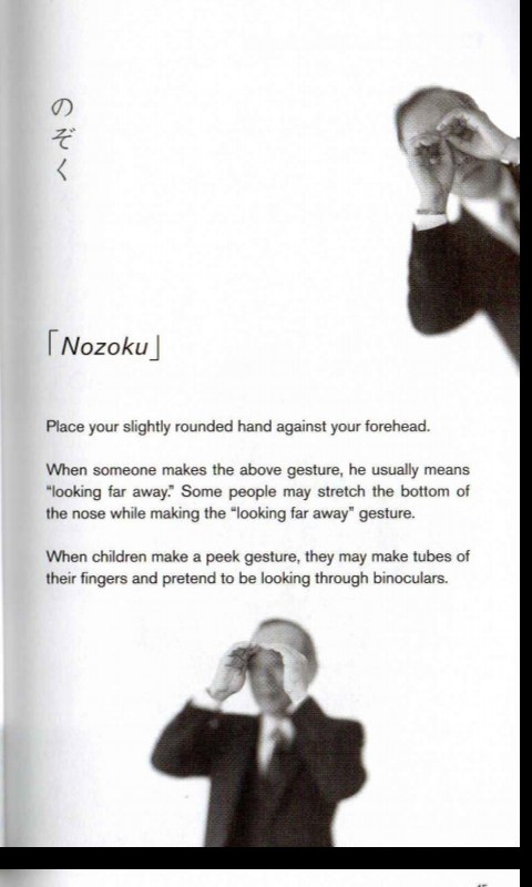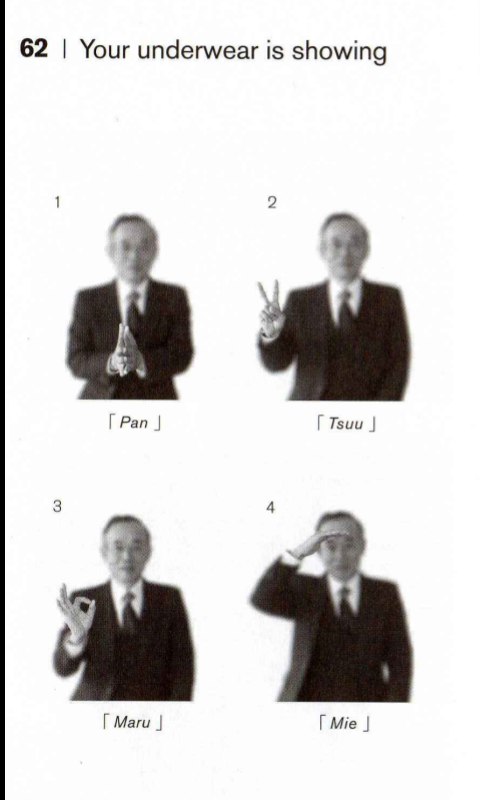 Насколько можно верить этой книжке - большой вопрос, потому что видео о японских жестах на YouTube, снятые самими японцами, либо по-другому трактуют жесты, упомянутые в книге, либо демонстрируют другие жесты, но с таким же значением. Чтение, тем не менее, в меру увлекательное и познавательное: автор пишет с большой иронией и откровенно стебётся как над японцами, так и над западными бакагайдзинами.