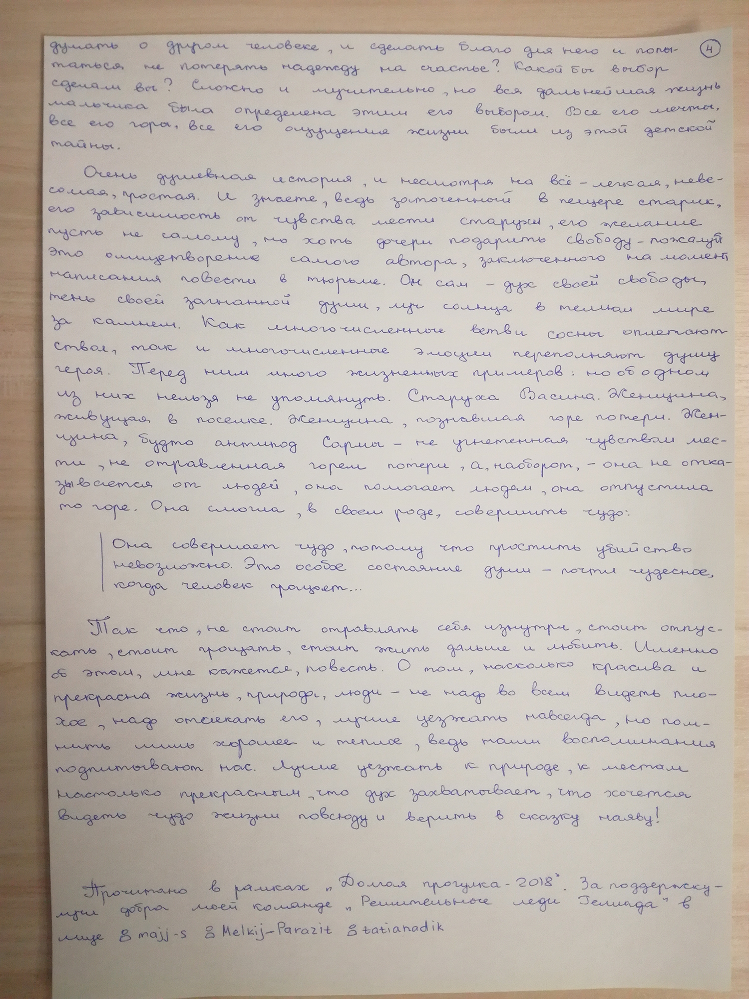 Очень душевная история, и несмотря на всё - легкая, невесомая, простая. И знаете, ведь заточенный в пещере старик, его зависимость от чувства мести старухи, его желание пусть не самому, но хоть дочери подарить свободу - пожалуй это олицетворение самого автора, заключенного на момент написания повести в тюрьме. Он сам - дух своей свободы, тень своей загнанной души, луч солнца в темном мире за камнем. Как многочисленные ветви сосны оплетают ствол, так и многочисленные эмоции переполняют душу героя. Перед ним много жизненных примеров: но об одном из них нельзя не упомянуть. Старуха Васина. Женщина, живущая в поселке. Женщина, познавшая горе потери. Женщина, будто антипод Сармы - не угнетенная чувством мести, не отравленная горем потери, а, наоборот, - она не отказывается от людей, она помогает людям, она отпустила то горе. Она смогла, в своем роде, совершить чудо: