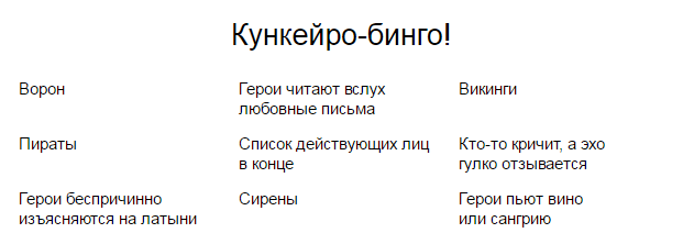 Если вы, как и я, уже к середине тома извели коробок спичек и завели привычку держать при себе флакончик с нашатырём, вот вам кункейро-бинго, которое не поможет победить скуку, но как-то её раскрасит. Играть в него просто: читаете новеллу (окей, это уже не так просто); отмечаете одни и те же ходы во всех текстах; тихонько плачете, представляя себе, что могли бы сейчас читать книгу получше, пооригинальнее или хотя бы потоньше.