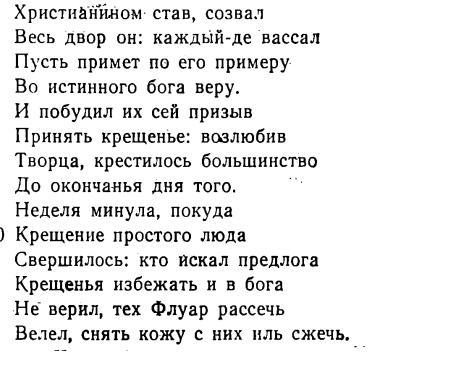 Также второй вариант заканчивается на победе Флуара в поединке. А вот у первого есть продолжение, в котором Флуар под воздействием любви к Бланшефлор переходит в христианство, а потом заставляет креститься все свое сарацинское царство-государство.