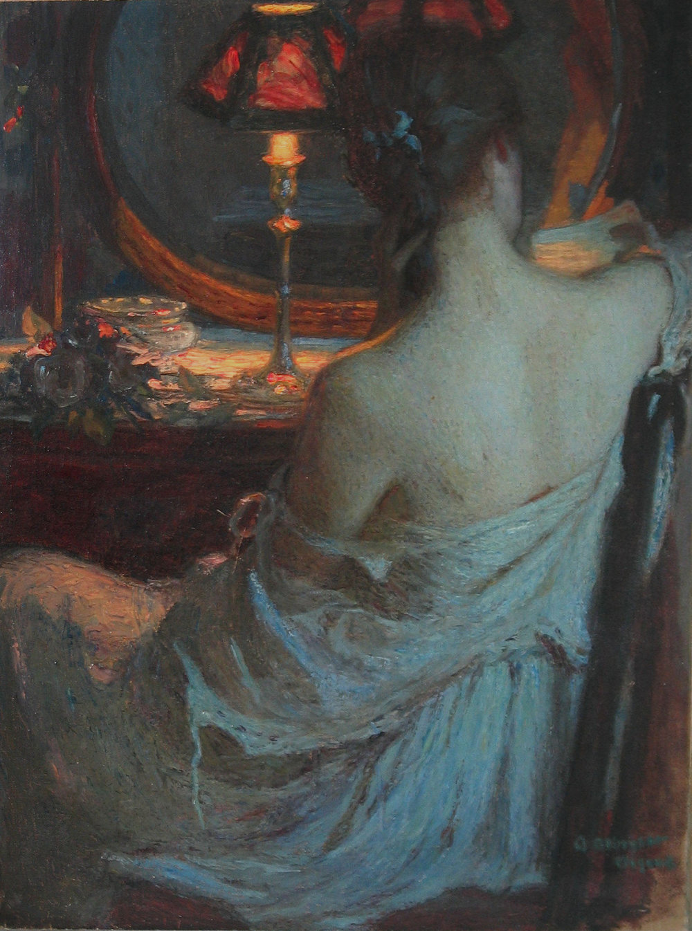 Трюмо открыто: фотография умершего мужа, лиловый флакончик духов Rochas Femme, увядший цветок возле книги...