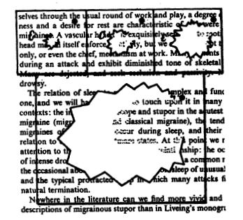 Расскажу, как это было первый раз...Первый раз, благодаря которому я поняла, что являюсь одной из немногих, страдающих классической мигренью. Подумаешь - мигрень, эка невидаль, кто ей не страдает! - скажете вы, но будете не правы, так как мигрень - это не простая головная боль, а имеющая свои особые признаки и стадии течения, а также множество форм, замысловатых причин возникновения и особенностей у каждого отдельного индивида. И ещё это загадочная болезнь, настоящие причины и механизмы возникновения которой до конца не выявлены. Так вот, когда меня впервые посетила эта таинственная мигрень, я занималась своим любимым делом - читала книгу, и вдруг я стала понимать, что не вижу букв, что они расплываются и пропадают, а страница будто разрезана на две части примерно так: