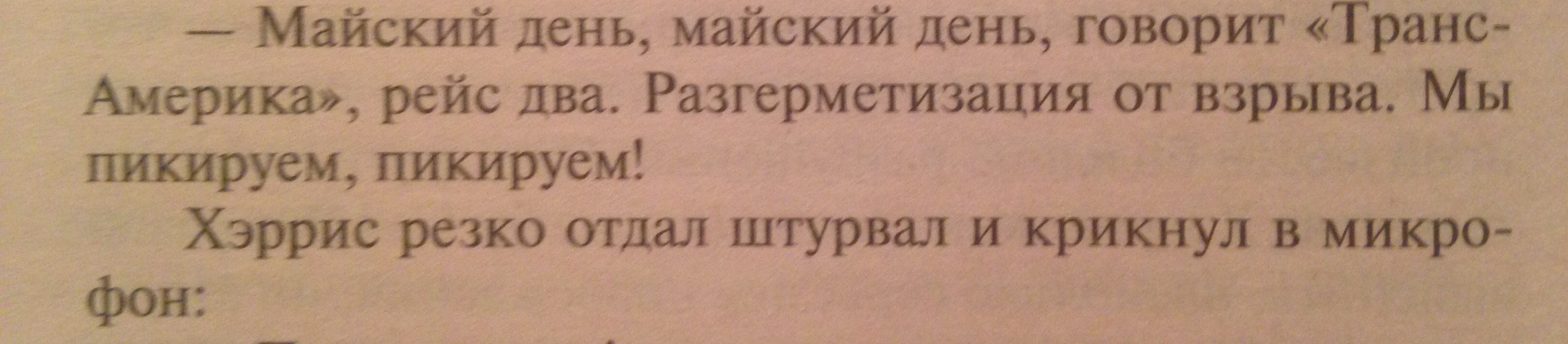шлдама, которая имеет двух любовников, будучи при этом замужем, и капитан самолета Вернон, который всю книгу дико бесит своим отношением к людям, особенно к женщинам, но в конце проникаешься к нему уважением как к профессионалу...Но на самом деле весь этот винегрет вертится лишь вокруг одного события, одной главной интриги. Нет, интриги даже наверно было 2, первая - взорвет ли Герреро бомбу, или ее таки удастся отобрать, и вторая - насколько успешно сядет самолет после того как взрыв все-таки произошел.Момент катастрофы читать было откровенно страшно, поэтому "Аэропорт" для меня приобрел нехилый такой привкус триллера, Стивен Кинг нервно курит в сторонке. Ну кто из нас хоть раз не испытывал приступы аэрофобии? Да, можно бесконечно себе твердить, что самолеты - это самый безопасный вид транспорта и куда больше шансов погибнуть в ДТП в машине, но на высоте 10 000 метров от родной земли, когда за окошком -50 градусов и воздух, непригодный для дыхания, такой аргумент кажется не сильно-то и утешающим. А момент разгерметизации салона из-за пробоины в хвосте, когда все неприкрепленные вещи вылетают в эту дыру теперь будет являться мне в кошмарах.