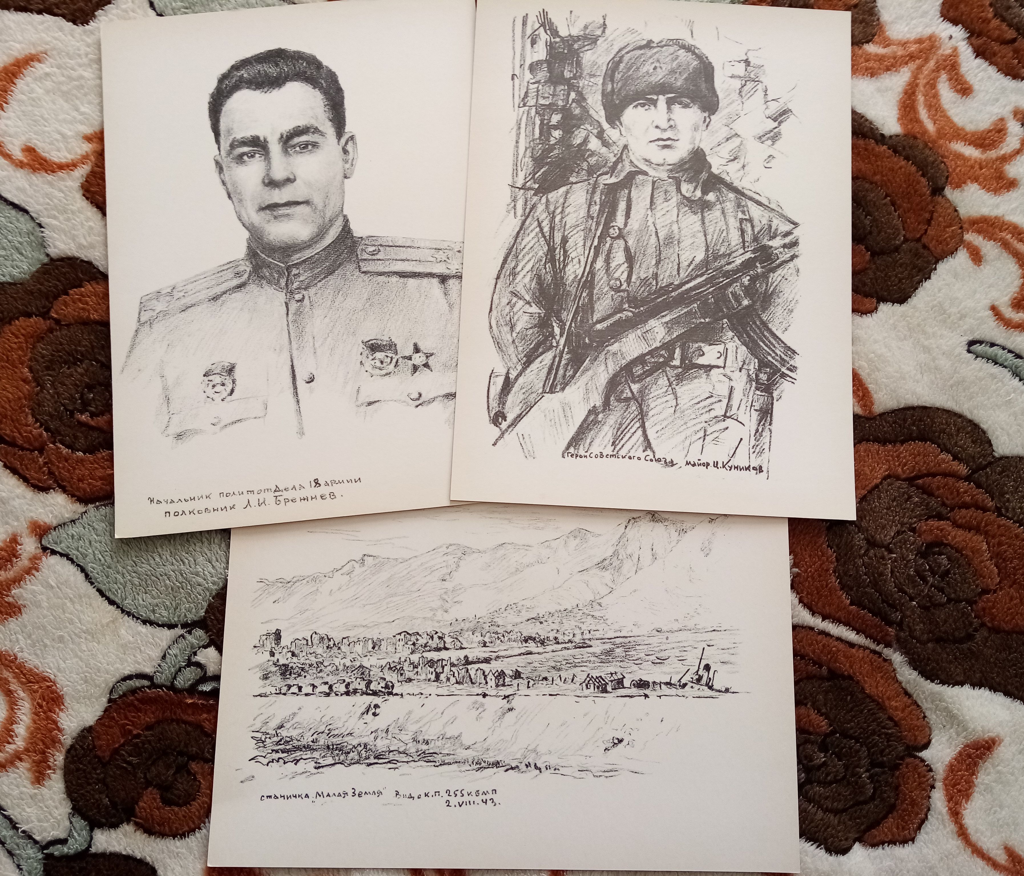 Примеры с портретами Леонида Брежнева, Цезаря Куникова и общим видом от советских позиций