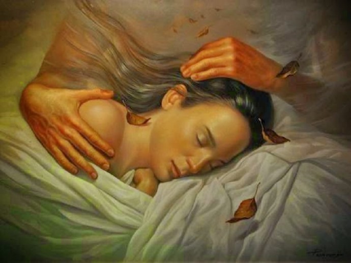 Я чуточку ревную тебя к себе же, когда смотрю на тебя, спящую: чтобы сказать тебе, как я люблю тебя, мне нужно было бы также уснуть рядом с тобой: ах, если можно было бы встреться во сне! Одно только грустно: быть может, мы бы не узнали друг друга во сне...Ну всё, не буду тебя тревожить, хорошая моя ( снимаю её очки, так же нежно, как если бы раздевал её спящую, чтобы ей удобней было бы спать; целую их в правую дужку, ещё тёплую от её ушка).