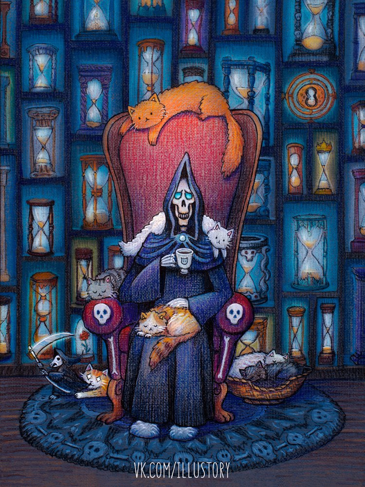 Читать далееИмею честь представить вам антропоморфную персонификацию, или, что будет несколько лаконичнее, - Смерть. Выглядит он, конечно, костлявенько, но у него весьма богатый внутренний мир и чуткое душевное устройство. Чувствовать Смерти, правда, не положено по должности, но думать о чувствах он может, и подзадолбаться, как оказалось, может тоже. Поэтому однажды он благополучно покидает свой стильный чёрный садик и идёт познавать простое человеческое. То есть рыбку ловить, на вечеринке тусить, пытаться друзей заводить. А в перерывах, для поддержания непоколебимой брутальности, поглаживать котиков. Такой вот он - Смерть.