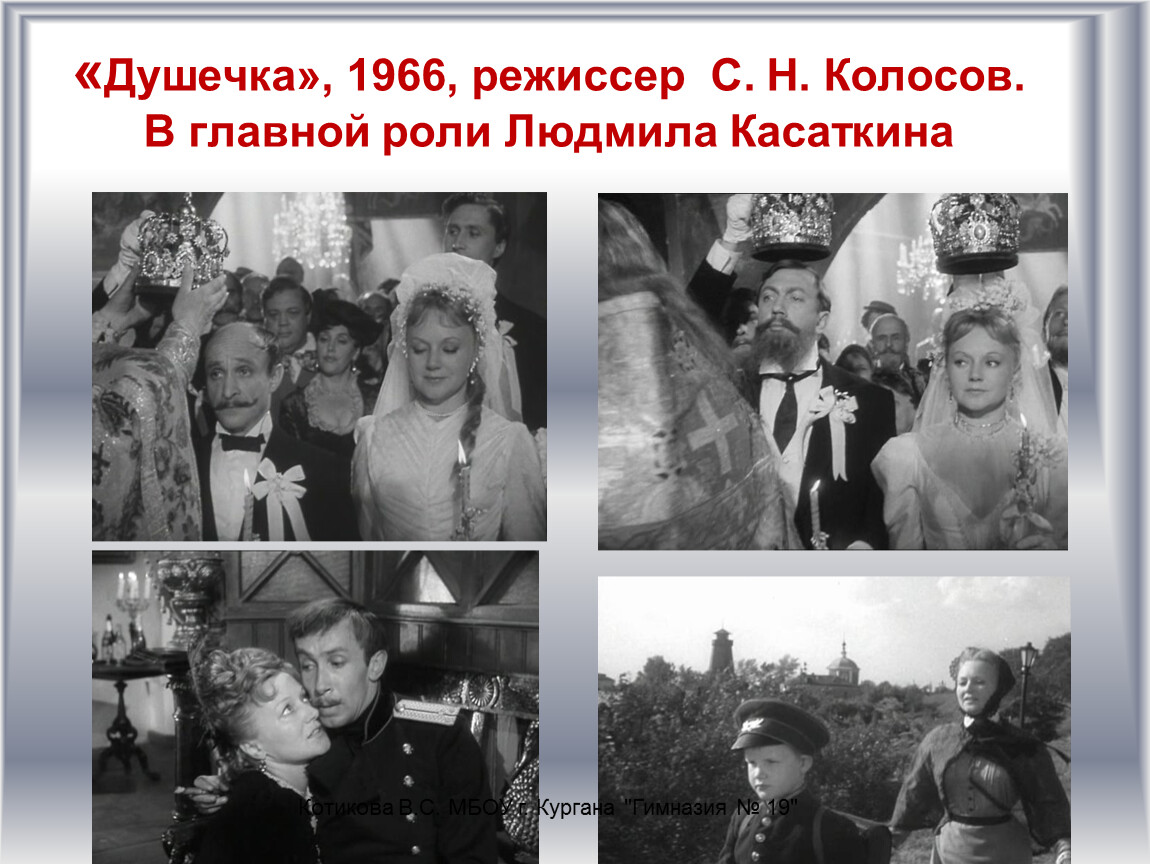 «Она постоянно любила кого-нибудь и не могла без этого»Любовь для героини – это неизбирательная привязанность к человеку, который совершенно случайно оказывается рядом. В рассказе по одному и тому же сценарию сменяются четыре привязанности Оленьки: антрепренёр, лесоторговец, ветеринар и его сын-гимназист. И всякий раз самым важным и нужным на свете для Душечки становится присваиваемое ею мнение каждого из них, порой вступающее в прямое противоречие с её же прежними высказываниями (о театре, лесе, здоровье домашних животных и учёбе в гимназии).