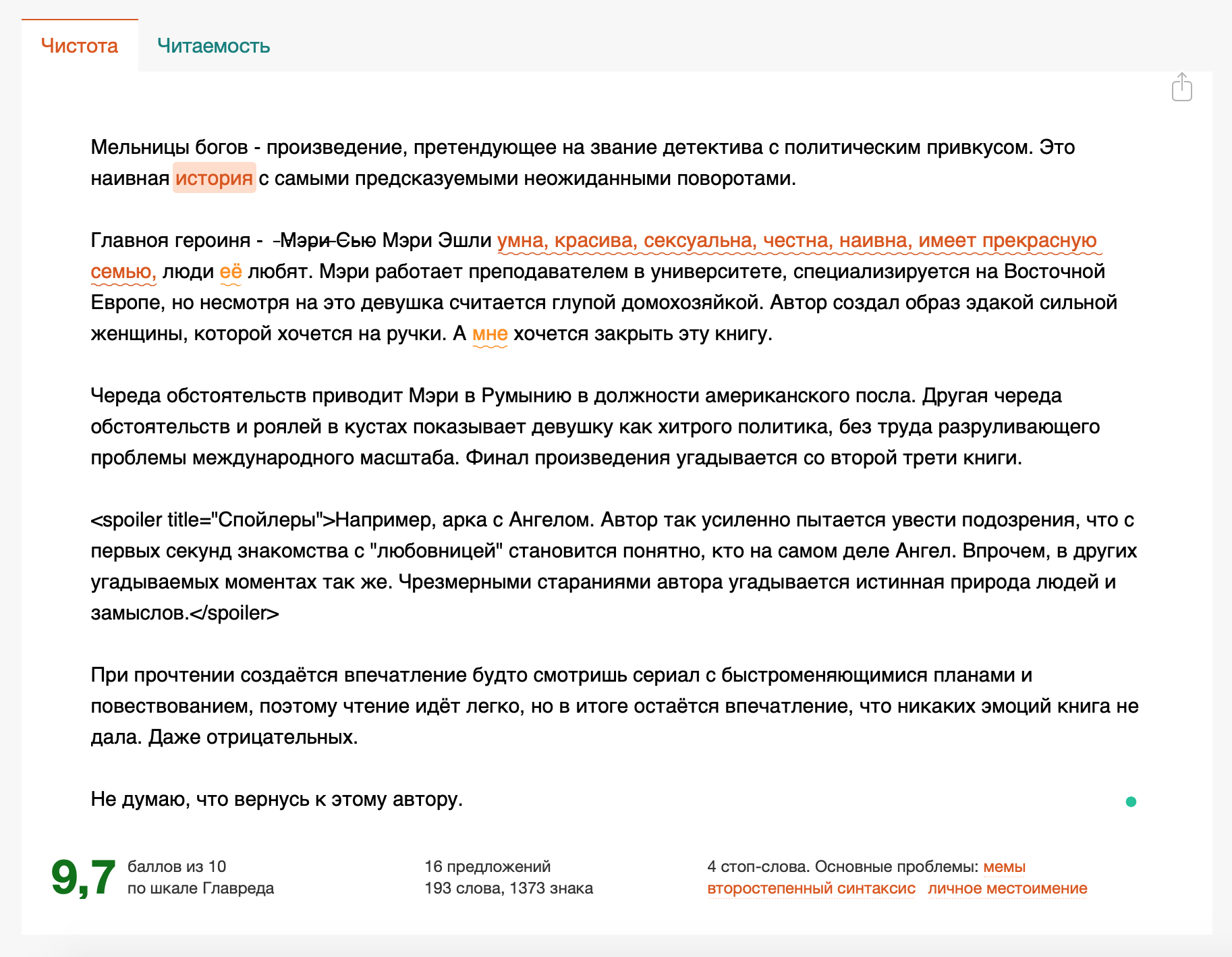 Например, арка с Ангелом. Автор так усиленно пытается увести подозрения, что с первых секунд знакомства с "любовницей" становится понятно, кто на самом деле Ангел. Впрочем, в других угадываемых моментах так же. Чрезмерными стараниями автора угадывается истинная природа людей и замыслов.При прочтении создаётся впечатление будто смотришь сериал с быстроменяющимися планами и повествованием, поэтому чтение идёт легко, но в итоге остаётся впечатление, что никаких эмоций книга не дала. Даже отрицательных.
