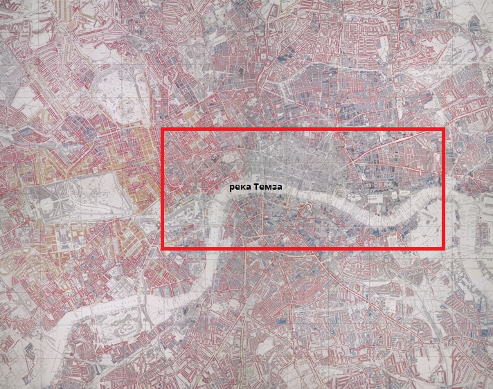 Дефо в своей книге пишет, что бедняки сыграли не малую роль в переносе заразы. Мне стало интересно проверить, так ли это? Я нашел карту бедности Лондона, но, к сожалению, только за 1889 год. Карту составил Чарльз Бут и она была самой первой картой Лондона такого толка. В прямоугольнике я обозначил тот участок города, который охватывает карта эпидемии выше. Как понять, какой район бедный, какой богатый? Очень просто: желтый - очень богатые (в обозначенном участке таких мест не так уж и много); красный — средний класс; черное, серое - ниже среднего, беднота.