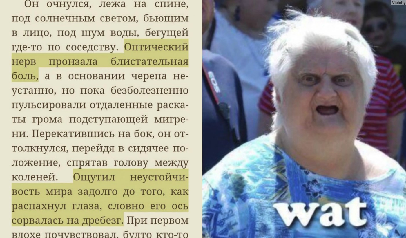 Слог мужицкий, волосатый и вонючий. Вот прям каждая страница попахивает тестостероном и брутальностью. Сначала я думала, что именно из-за этого книга идет у меня достаточно тяжело, но неееет. Тут на подмостки выбегает второй по важности человек - переводчик с синдромом Вовки из Тридевятого царство.