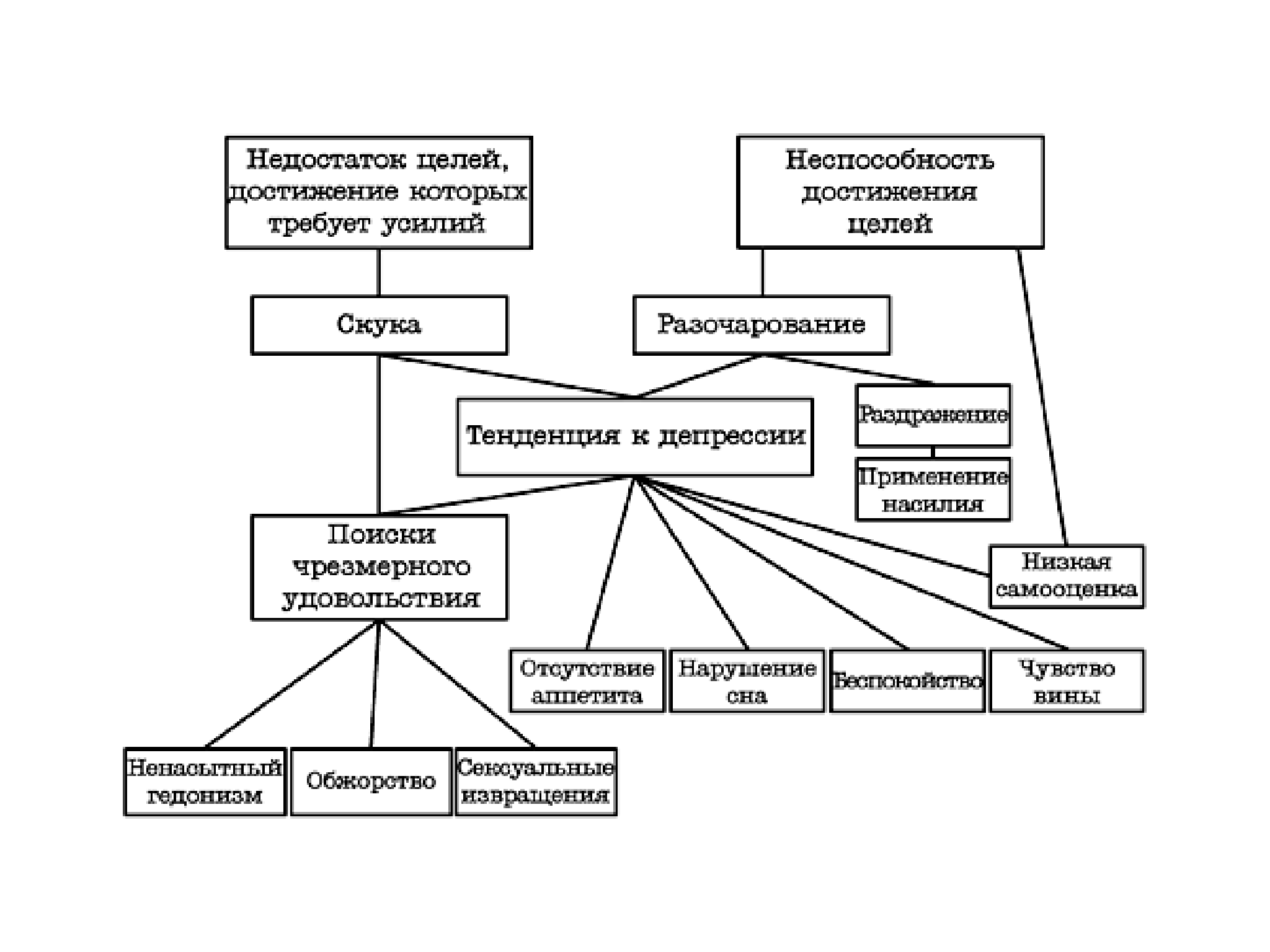 [17] Некоторые из перечисленных симптомов напоминают черты поведения сидящих в клетке зверей. Попробуем объяснить, как эти симптомы возникли из-за лишения процесса власти. Здравое понимание человеческой природы говорит, что недостаток целей, достижение которых требует усилий, приводит к скуке, и эта тоска, продолжающаяся долгое время, в конечном итоге часто приводит к депрессии. Неспособность достигнуть цель приводит к чувству разочарования и снижению самооценки. Разочарование ведёт к раздражению, раздражение к агрессии, часто в форме насилия над супругой (супругом) или ребёнком. Достаточно очевидно, что долго продолжающееся чувство разочарования обычно приводит к депрессии, и что эта депрессия служит причиной чувства вины, нарушения сна, отсутствия аппетита и плохого отношения к самому себе. Есть такие люди, которые в качестве противоядия от депрессии прибегают к различным видам наслаждения, отсюда ненасытный гедонизм и неумеренный секс, включающий и извращения как средства получения нового кайфа. Скука также приводит к чрезмерным поискам удовольствий, так как, ощущая нехватку других целей, люди часто воспринимают наслаждение как цель. См. сопроводительную диаграмму. Однако, всё вышеперечисленное упрощено. Реальность намного сложнее, и, конечно, лишение процесса власти не является ЕДИНСТВЕННОЙ причиной описанных симптомов. Кстати, когда мы упоминаем депрессию, мы не обязательно имеем в виду депрессию, из-за которой следует обращаться к психиатру. Часто протекают лишь её лёгкие формы. И когда мы говорим о целях, мы не обязательно подразумеваем долговременные, надуманные цели. На протяжении длительной человеческой истории для многих или большинства людей было вполне достаточно цели скудного существования (единственно изо дня в день обеспечивать себя и свою семью едой).