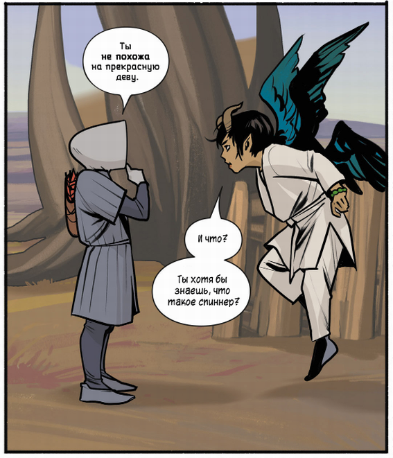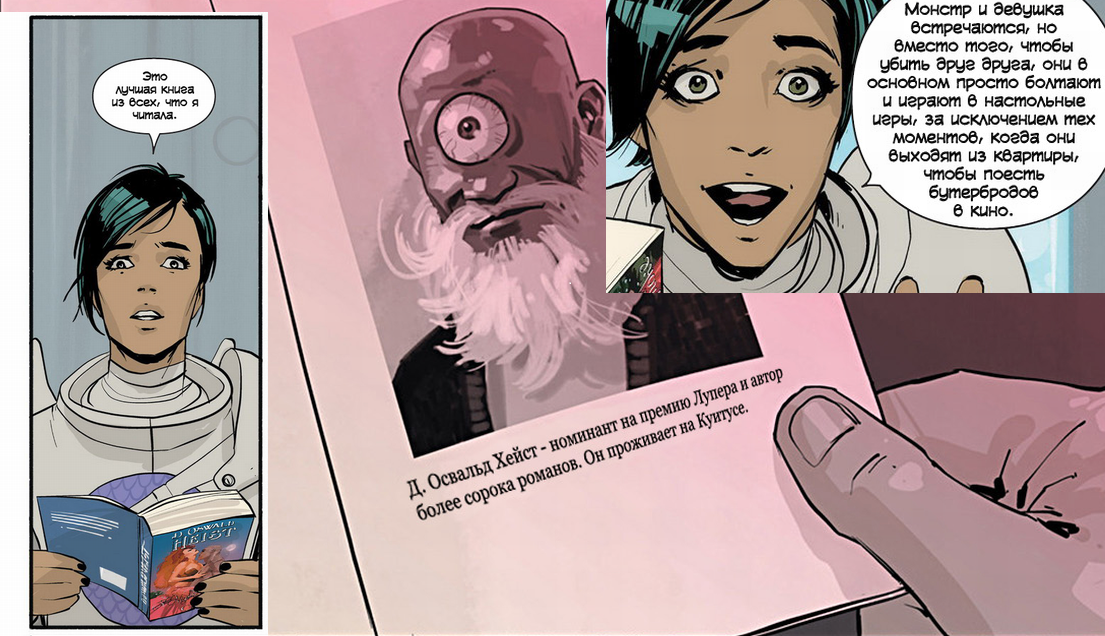 И вот они бегут спасая свою семью... Ах да, повествование ведётся от лица девочки, этого ребёнка, она вспоминает свою семью, своё детство. Ну так вот, они бегут и бегут, при этом теряя друг друга, но потом снова воссоединяясь, потом опять кого-то теряя и снова находя,... и через глав-книг двадцать, всё это, как-то становится бессмысленным. И ты понимаешь, что название - сага, это не только космическая сага, но в первую очередь семейная сага. Так долго читать про эту семью, со временем сам становишься частью этой семьи, но это не заслуга авторов комикса, так умеют все сериалы, от бразильских мыльных, до каких нибудь игрпрестольных. Комикс не дописан, но в том конце который есть сейчас, их всё же настигают и часть героев, к которым привязываешься, погибает. Они так долго бежали и прятались, очевидно, это нужно было чем то закончить, хотя бы ради паузы.