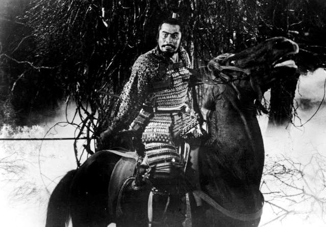 Тосиро Мифунэ в роли Макбета, "Трон в крови"Как это ни печально, но в шекспировском описании политической борьбы за власть есть неутешительный и очевидный для современности диагноз: невозможно стать королем, оставшись человеком. В любом случае придется выйти за грань, нарушить законы мироздания. История Макбета, ослепленного пророчеством и змеиными уговорами жены, настолько абсурдна, что сама природа как будто восстает против власти человека: