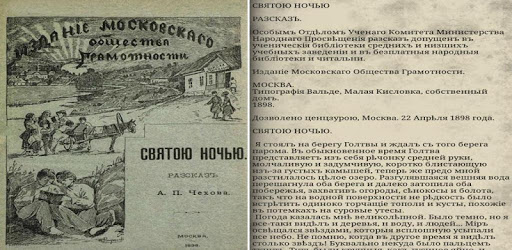 «Святою ночью» - один из лучших пасхальных рассказов Чехова. В центре повествования – два монаха, наделённых не только добротой и смирением, но и даром поэтической восприимчивости. Смерть одного из них (талантливого сочинителя акафистов иеродьякона Николая) накануне Пасхи подчёркивает его избранность: «Кто умрёт под Пасху или на Пасху, тот непременно попадёт в царство небесное». Его друг и благодарный слушатель акафистов послушник Иероним, перевозящий прихожан в пасхальную ночь на пароме через реку к монастырю, скорбит об умершем, а также сожалеет, что не может присутствовать на праздничной службе. «Отчего это даже и при великой радости человек не может скорбей своих забыть?».