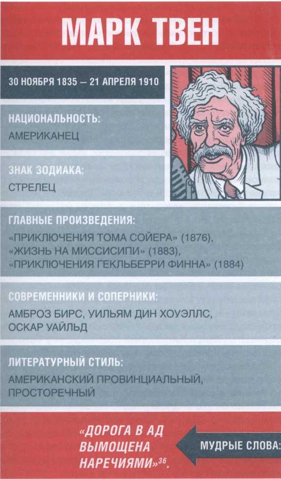 Биографии писателей, краткая сводка о каждом: годы жизни, произведения, национальность... Рисунки-портреты - тоже не лишние, хоть и выполнены в довольно карикатурном стиле. Вступительные статьи и некоторые факты - заслуживают внимания. Некоторые - действительно было интересно читать, вроде статей про Хэма (Папу, как его упорно зовет автор), Марка Твена...