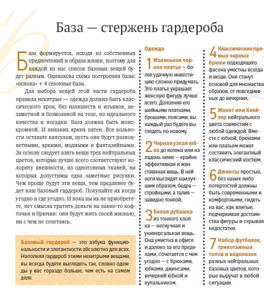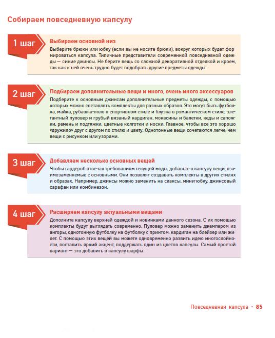 Идея «капсульного гардероба» мне тоже пришлась по душе, но капсулы собирать довольно долго, а многие советы из книги можно использовать прямо с ходу (там куча приемов сочетания всего со всем, например, или классная идея сделать на дверь шкафа таблицу совместимости вещей).