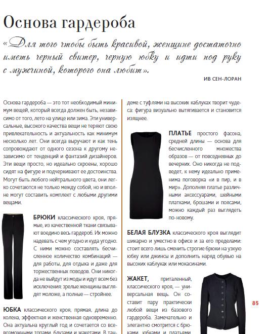 Авторы очень убедительно рассказывают о том, что теоретически должно быть в гардеробе и чем оно отличается от того, что есть (типичные ошибки, оказывается, совершенно общие у всех), как приблизить второе к первому. Особенно мне понравился раздел про деловые капсулы — я так люблю, когда люди ходят на работу в нескучных вещах, а там прямо руководство по тому, как сделать яркие комплекты и как определить, в каких ситуациях что больше подходит. Ура, в общем!