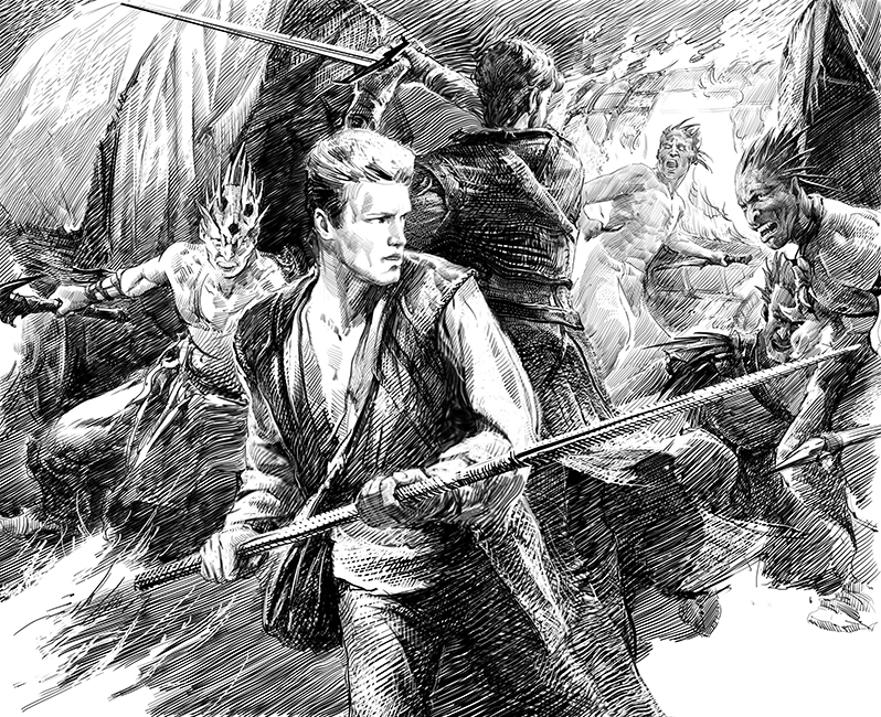 Естественно, искать приключения на свои конечности он будет не один, а в компании. По правую руку от него окажется сойка Лавиани - не птица, но личность выдающаяся с четырьмя татуировками бабочек, летающих над водопадом, с седыми волосами, холодными голубыми глазами, жизненным опытом в пятьдесят лет за плечами и массой любопытных способностей в придачу. Собственно, это она сидит у реки на фронтисписе. По левую руку - указывающая путь Шерон, недонекромант, в обязанности которой входит борьба с заблудившимися - существами, в которых превращаются люди, умершие в герцогстве Летос в тёмное время суток (повадки у них, надо сказать, самые зомбячно-упыриные), с рядом с которыми пламя окрашивается в синий цвет.