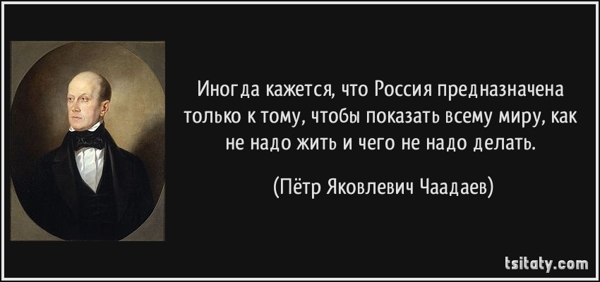 Я люблю свое отечество, как Петр Великий научил меня любить его. Мне чужд, признаюсь, этот блаженный патриотизм, этот патриотизм лени, который умудряется все видеть в розовом свете и носится со своими иллюзиями, и которым, к сожалению, страдают у нас теперь многие дельные умы...Петр Яковлевич Чаадаев, 1837.