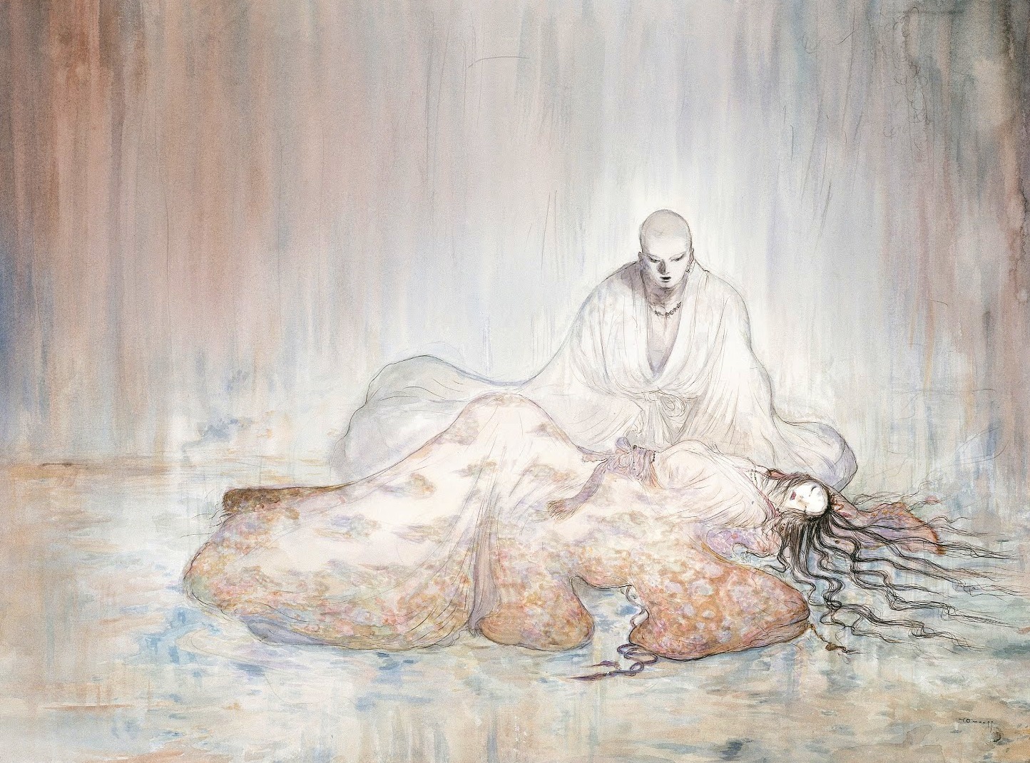 Полноценная графика Амано не вполне иллюстрации к тексту. Это серия рисунков на сюжет повести Геймана. Часть из них с акварельной нежностью подражает старинным японским гравюрам – удивительные рельефные фоны, широкие складки орнаментированных одежд, характерная проработка мимики, в том числе животных. Насыщенные цветом сцены сменяются воздушными, с почти неуловимыми тонкими карандашными контурами фигур. В путешествиях по миру снов Амано пользуется психоделическими приемами европейских модернистов. Вторую группу работ составляют мрачные, плотные карандашные этюды. Как будто наброски, эскизы, незавершенный набор быстрых, неровных штрихов. Извилистыми нитями они сплетаются в фигуры и пространство – изнанка красочного и динамичного мира. Есть и одна черно-белая акварель. Та самая сцена, где Морфей появляется в образе черного лиса. Он сам, и тем более белая лисица, героиня повести, теряются среди вздыбленных горных утесов. Фигуры – лишь маленькие детали на полотне мироздания. А самого Сна Амано изобразил так, что без улыбки смотреть нельзя. На чёрном плаще нет знаменитых языков пламени, как и звезд в глазах. Зато ретро-прическа и тщательно прописанные многочисленные украшения в восточном стиле выдают звезду J-Pop, кумира молодежи, немного андрогинного и готически харизматичного.