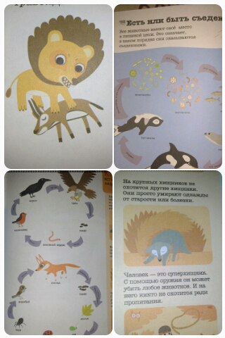 Однако, возрастная группа "для младшего школьного возраста" указана здесь не просто так. Странно, что нет пометки 6+ на обложке, ведь уже на первой странице мы читаем о том, что животные - это такие существа, которые рождаются, двигаются, питаются, рожают детенышей и умирают. И мертвая антилопа нарисована.