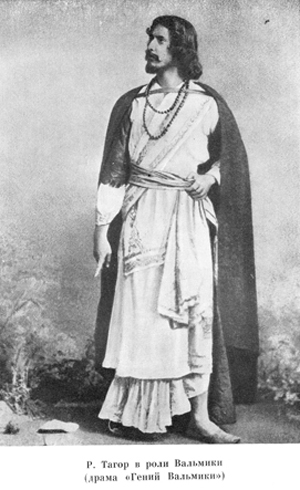 Мне уж не быть несчастным.В пьесах Тагора сплелись индийские мистерии, европейский символизм, традиционные песни и танцы (для которых он, как выяснилось, сам писал музыку), цитаты из национальной классики, что наверняка узнавались, а возможно, и подхватывались зрителями. Они поэтичны, прихотливы, дышат экзотикой. Мне представляется, что их играли на открытом воздухе, среди деревьев, цветов и трав, которые служили лучшими декорациями. Приятно было узнать, что Тагор сам принимал участие в спектаклях. Смотрите, красавец какой: