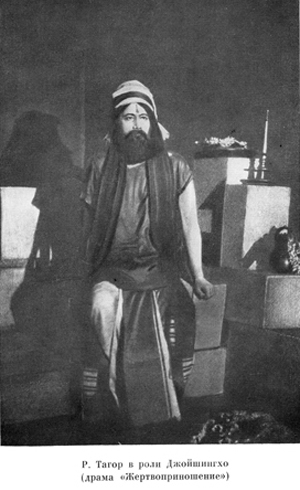 Вот только с подписью у второй фотографии неувязочка вышла, скорее всего. Джойшингхо — воспитанник и ученик жреца Рогхупоти, того самого, что готов был храм в крови утопить, лишь бы не уступить власть радже, помните? Ну не похож никак на этом фото автор пьесы на юношу бледного со взором горящим. А кроме того, в комментариях сказано, что Тагор неизменно выступал в роли как раз Рогхупоти (!). Любопытно как. Оставлял за собой, значит, самую отрицательную роль. Совсем как Леонид Филатов в «Сукиных детях», царство ему небесное...