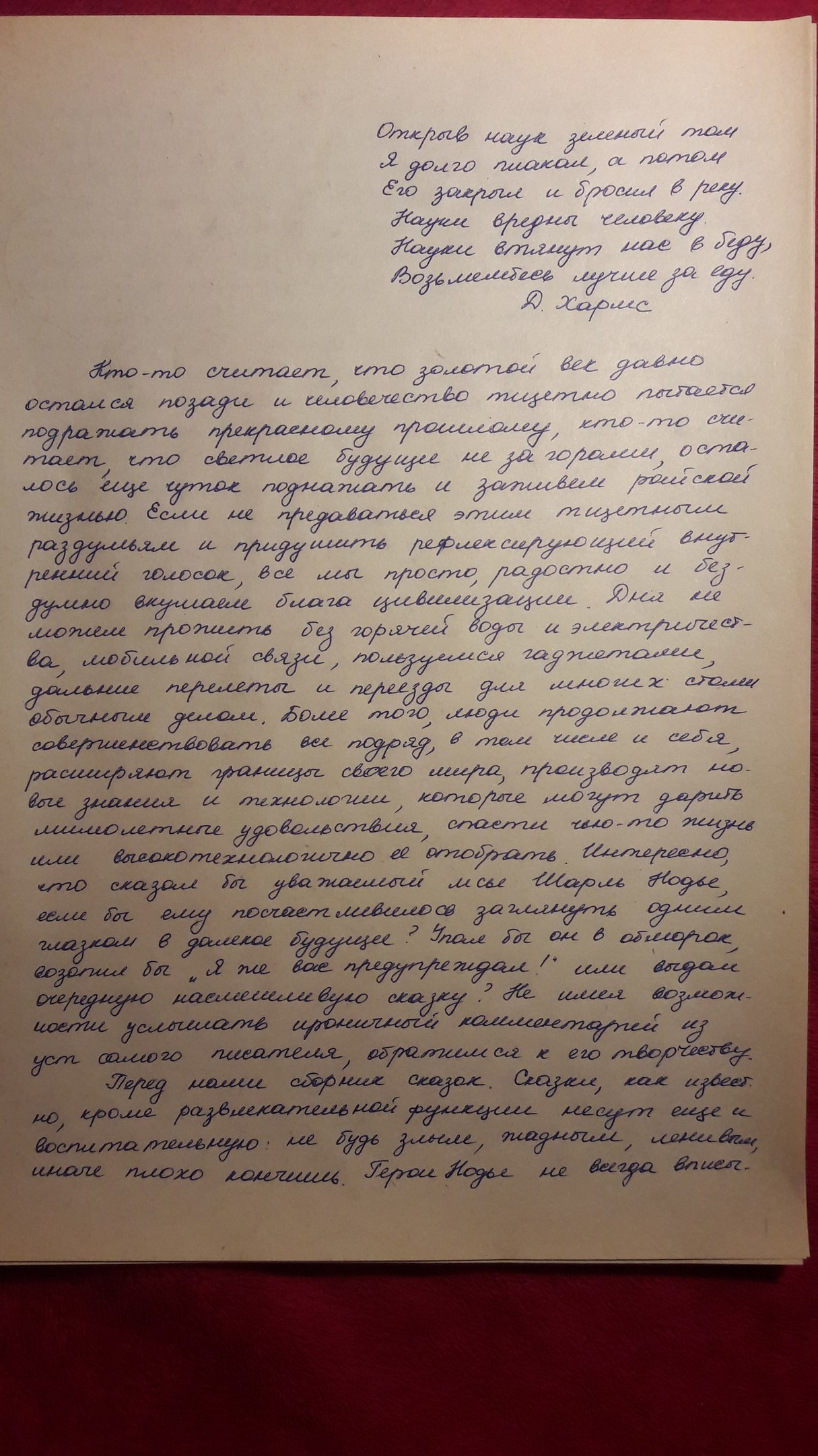 Д. ХармсКто-то считает, что золотой век давно остался позади и человечество тщетно пытается подражать прекрасному прошлому, кто-то считает, что светлое будущее не за горами, осталось еще чуток поднажать и заживем райской жизнью. Если не предаваться этим тщетным раздумьям и придушить рефлексирующий внутренний голосок, все мы просто, радостно и бездумно вкушаем блага цивилизации. Дня не можем прожить без горячей воды и электричества, мобильной связи, пользуемся гаджетами, дальние перелеты и переезды для многих стали обычным делом. Более того, люди продолжают совершенствовать все подряд, в том числе и себя, расширяют границы своего мира, производят новые знания и технологии, которые могут дарить мимолетные удовольствия, спасти чью-то жизнь или высокотехнологично ее отобрать. Интересно, что сказал бы уважаемый мсье Шарль Нодье, если бы ему посчастливилось заглянуть одним глазком в далекое будущее? Упал бы в он обморок, возопил бы «Я же вас предупреждал!» или выдал очередную насмешливую сказку? Не имея возможности услышать ироничный комментарий из уст самого писателя, обратимся к его творчеству.