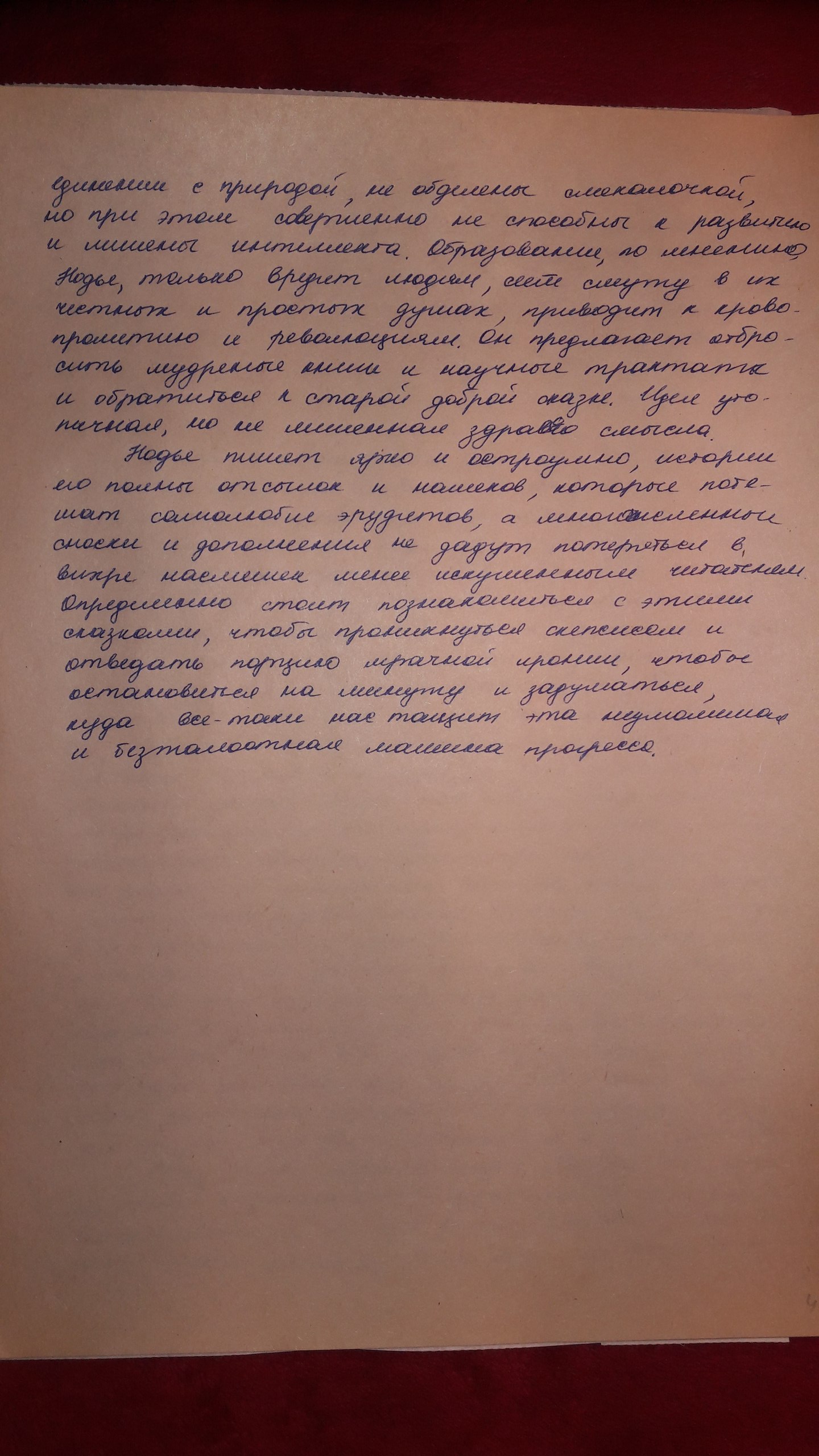 Но одно дело - додуматься до них как бы самостоятельно, а другое - найти подтверждение на бумаге, на напечатанной странице, которому уже почти 200 лет. Не то, чтобы всё напечатанное, имеющее солидный возраст, суть незыблемая истина, но если кто-то с Вами соглашается, Вы же чувствуете в своих догадках некоторую уверенность и видите в них уже не просто «шальные мысли»? Так что Шарль Нодье лишь подчёркивает/подталкивает к этим банальным, оттого бесконечно грустным, ведь так будет ещё ооооочень долго, реальностям.