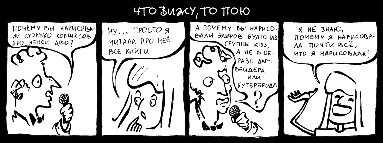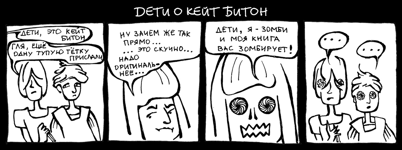 В-третьих, кажется, не очень удачно выбрана аудитория комикса.Из плюсов, были действительно смешные и оригинальные вещи. Мне очень понравилось всё про писателей и идея рисовать содержание по обложкам книг. Рисовка минималистичная, но приятная.