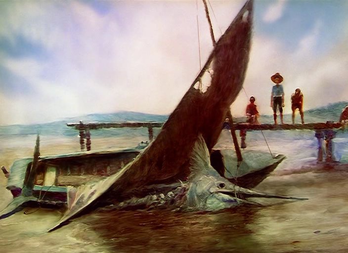 В итоге от пойманного огромного марлина остался только скелет и голова — с такой добычей старик и причалил к родному берегу...