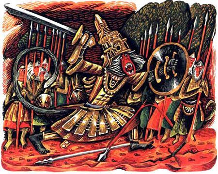Что сделал Святослав Сахарнов? Взял великий индийский эпос "Рамаяна", выкинул из него невероятно много и оставил эпичную историю о том, как принца Раму подставила злобная старуха, отправив его в изгнание. Как верная Сита последовала за своим мужем и была похищена демоном. Как обезьяна-герой Хануман собрал обезьяньи же войска и пошел в поход на демонов-ракшасов, как сражались герои, как действовала великая магия. И вот это вот всё уместил он в небольшую детскую книжку. А художник Ромадин создал к ней отличнейшие иллюстрации.