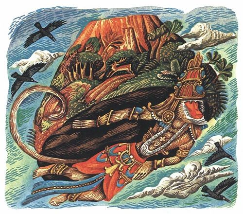 Аноним4 июля 2021 г.Читать далееМой любимый герой в этой книге — обезьяний вождь Хануман, благородный и преданный, а любимый фрагмент — Хануман ради скорости вместе с целебной травой несёт гору. Тот случай, когда волшебный помощник из вспомогательного состава переходит в главный, а главные герои отходят на задний план. Рама и Сита, ради которых всё затевалось, на фоне Ханумана бледнеют и меркнут. А ещё вспоминаются летучие обезьяны из «Волшебника из страны Оз/Изумрудного города» — интересно, есть ли тут связь, читал ли Фрэнк Баум Рамаяну.