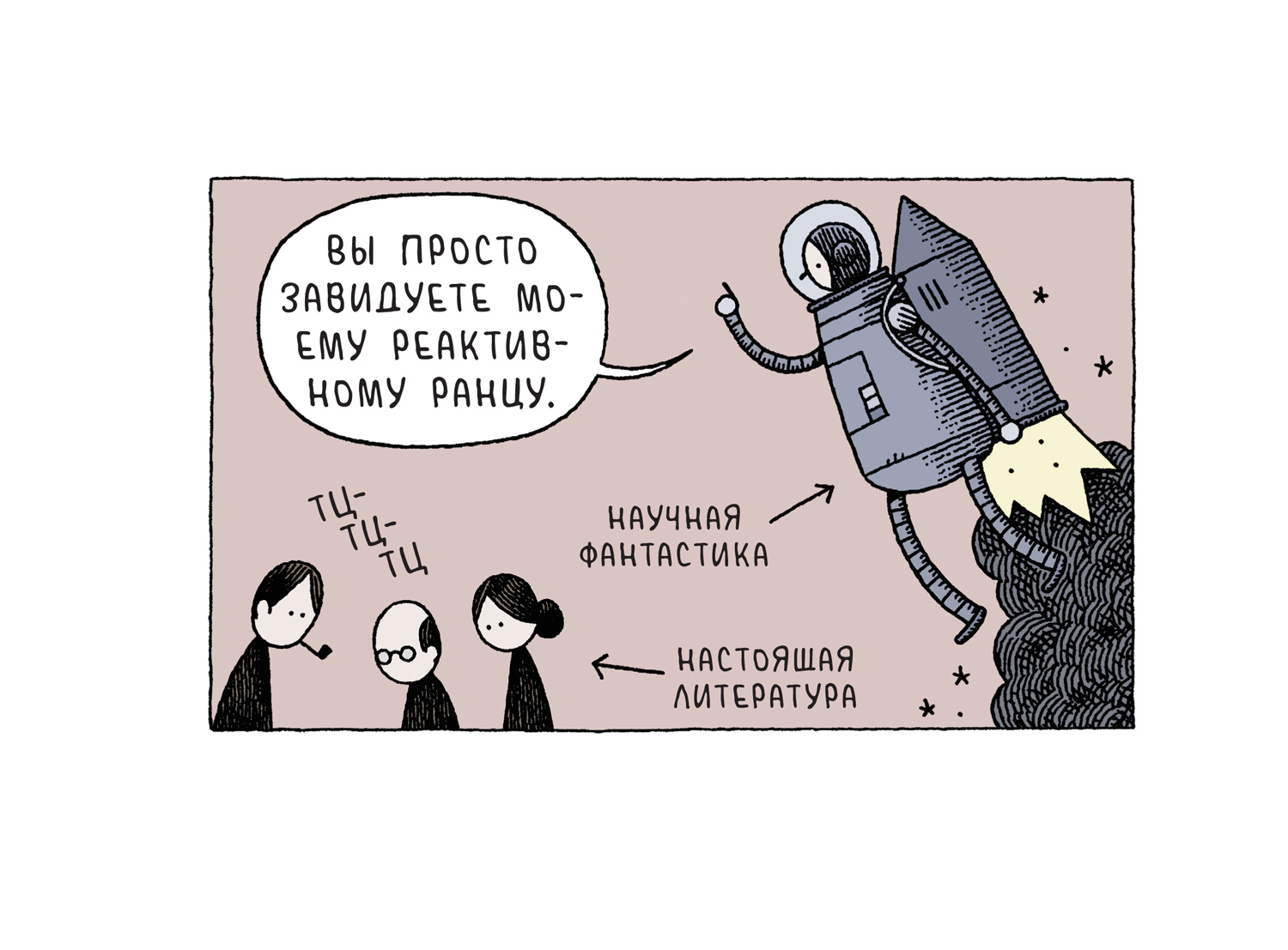 Оказывается, почти все комиксы, которые понравились мне за последние пару лет, принадлежат ему — и про короткие рассказы, и про поэзию левшей из Скандинавии, и, о господи, про мышку, птичку и сложный роман, который особенно актуален в это время года. Даже ту открытку про отсеки для чтения в 500 метрах над землёй, что взялась у меня неизвестно откуда и лежала-лежала, пока наконец не нашла своё место в библиотеке, нарисовал он. И эта гениальная картинка, которая давным-давно висит на моей странице, тоже его рук дело.