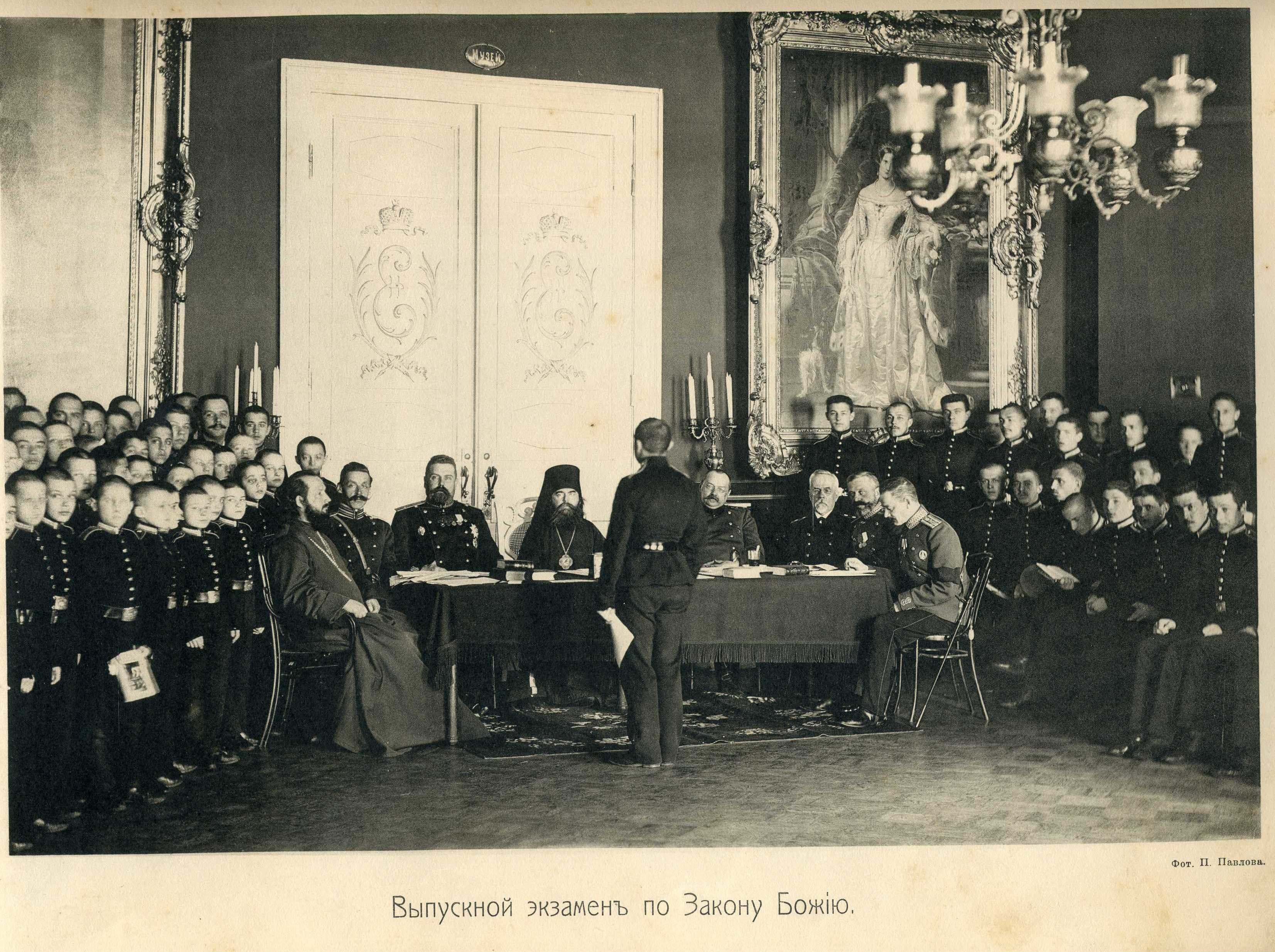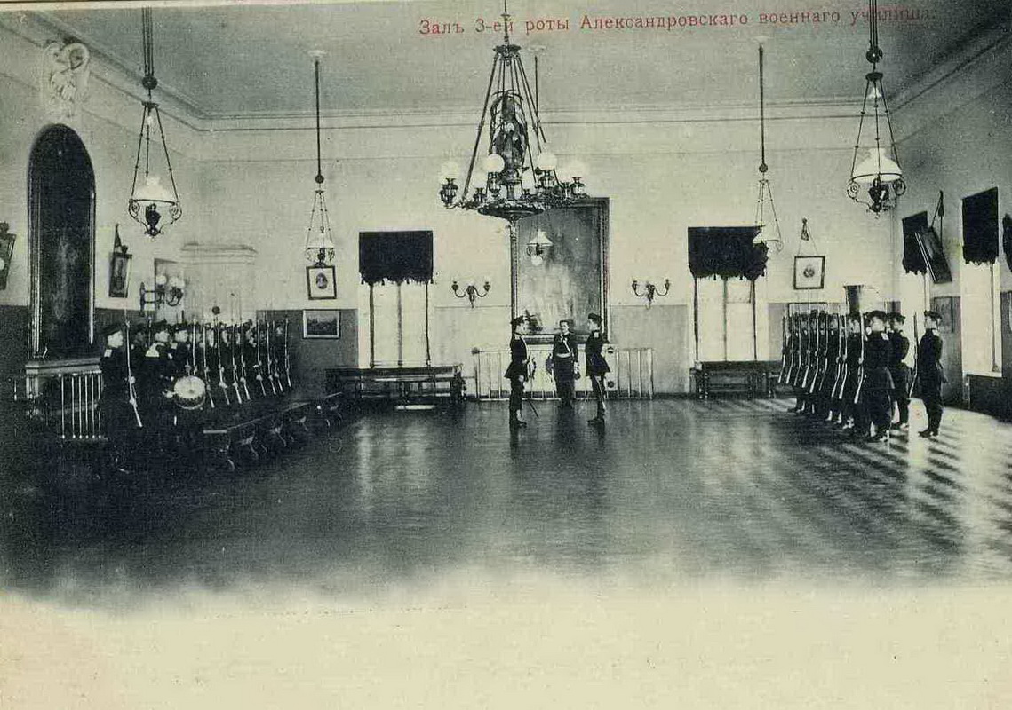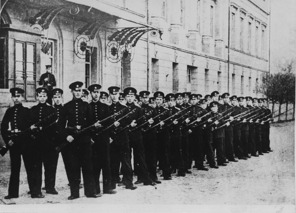 Его невольно и как-то печально поразило: какая малая кучка сверстников собралась в голубой просторной комнате, – пятнадцать-двадцать человек, не больше, а на последних экзаменах их было тридцать шесть. Только спустя несколько минут он сообразил, что иные, не выдержавши выпускных испытаний, остались в старшем классе на второй год...Кадеты VII класса 1-ой роты на строевых занятиях